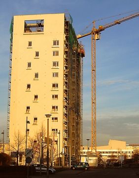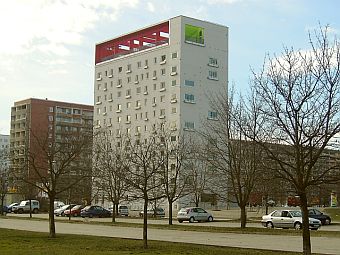 "Lausitz-Touver",ein altes Plattenhochhaus,welches zu einem modernen Wohn-und Geschäftshaus mit Aussichtplattform umgebaut wurde,zeugen vom raschen Wandel in der Neustadt.